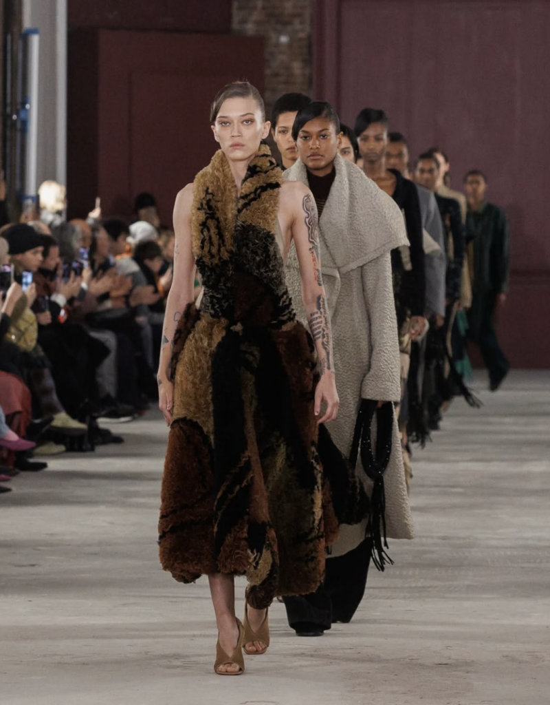 While timelessness was a major theme this season, texture still took center stage—most notably at Louise Trotter’s Bottega Veneta, where oversized faux fur coats, evolving from her previous work, made a strong impact on the runway.